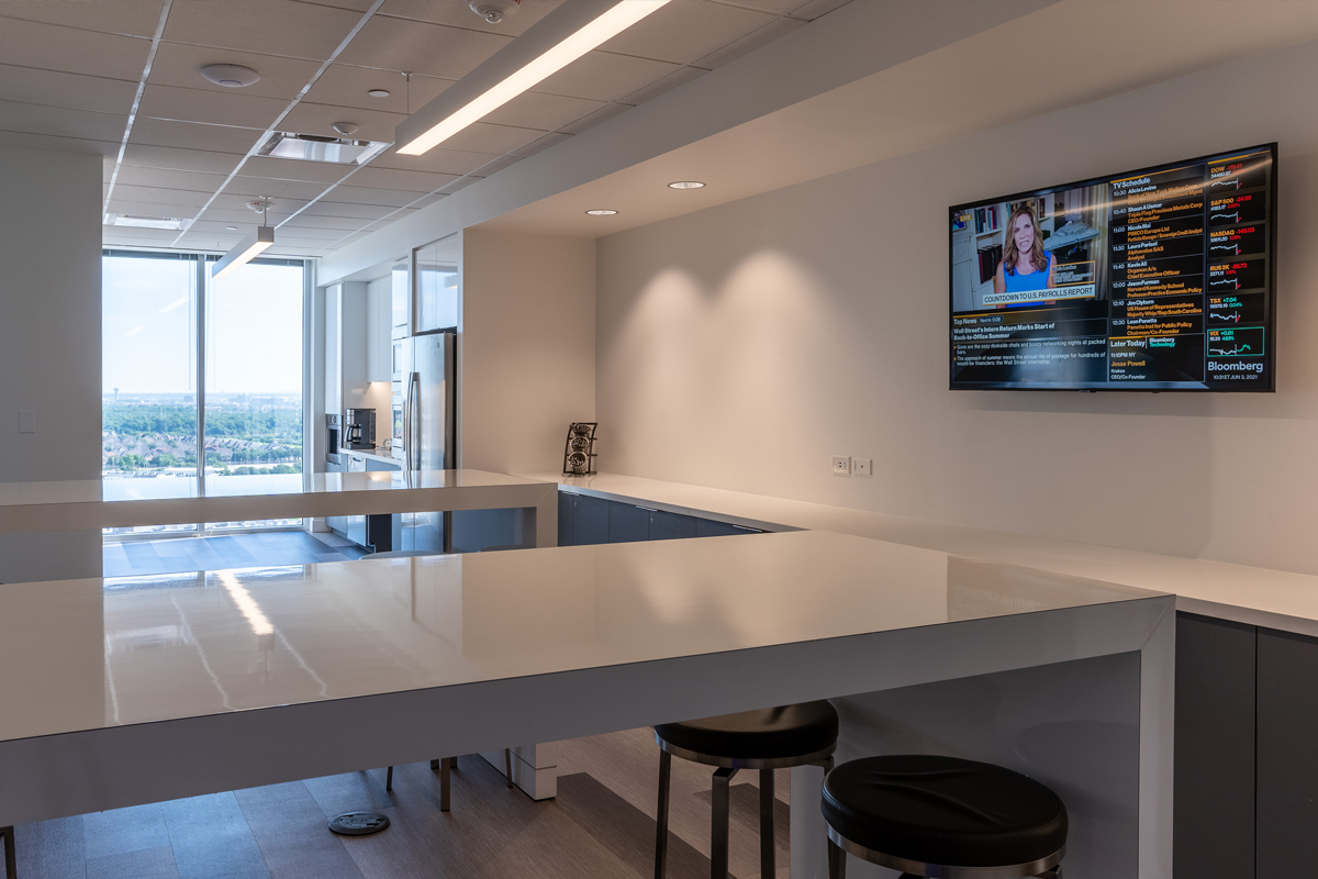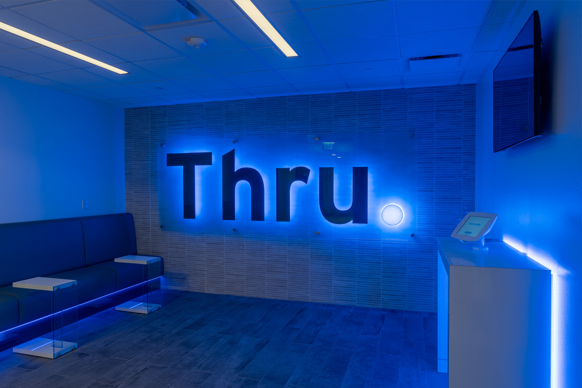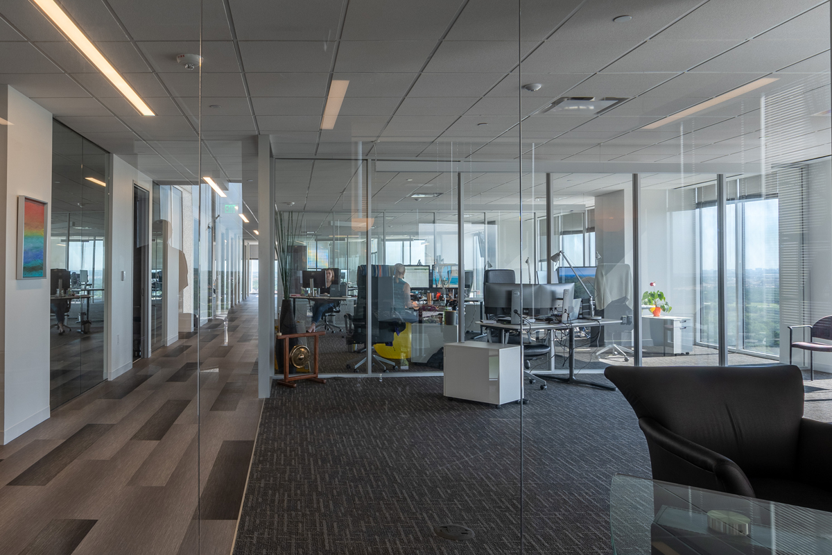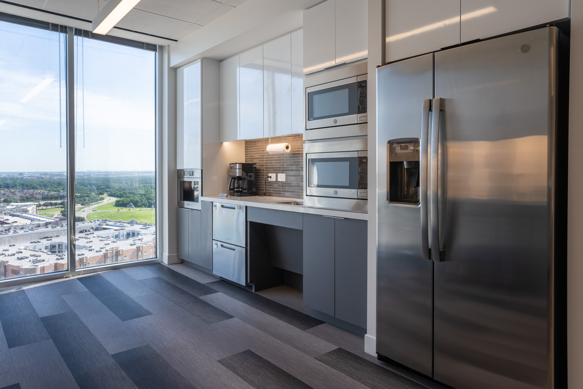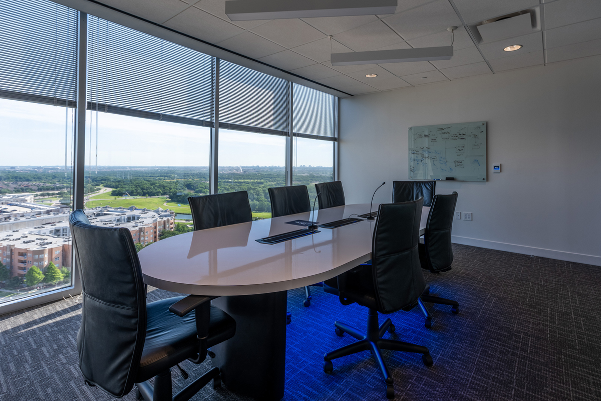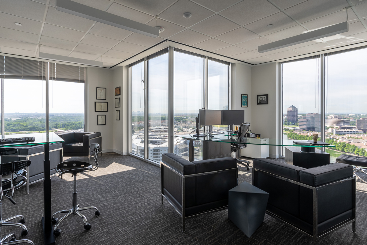 This newly designed and built office in Tower 909 at Lake Carolyn in Las Colinas in the new home to THRU occupying a quarter of a floor. The renovation involved extensive demolition of glass partitions and the installation of new office partitions, glass fronts, updated flooring, fresh paint, and all-new energy efficient Led lighting throughout.